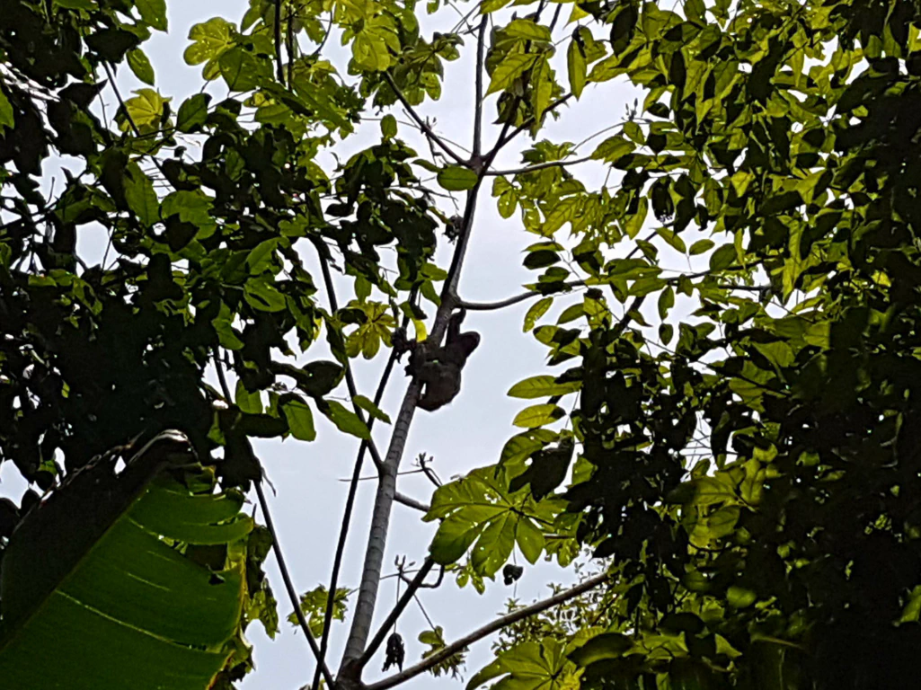 Nachdem die ersten Gruppen Krebse, bunte Insekten und Kolibris beobachteten, für die man ohne Fernglas ziemlich aufgeschmissen war, ging es auf dem Sendero de Perezoso, übersetzt Faultier-Pfad, schon wesentlich interessanter zu. Tatsächlich erspähten wir einige Faultiere, allerdings war das Hautnah-Erlebnis eher von der Art: Seht ihr dort oben, wo sich die beiden Äste teilen, den dunklen Fleck in der Gabelung? Das ist ein Faultier.