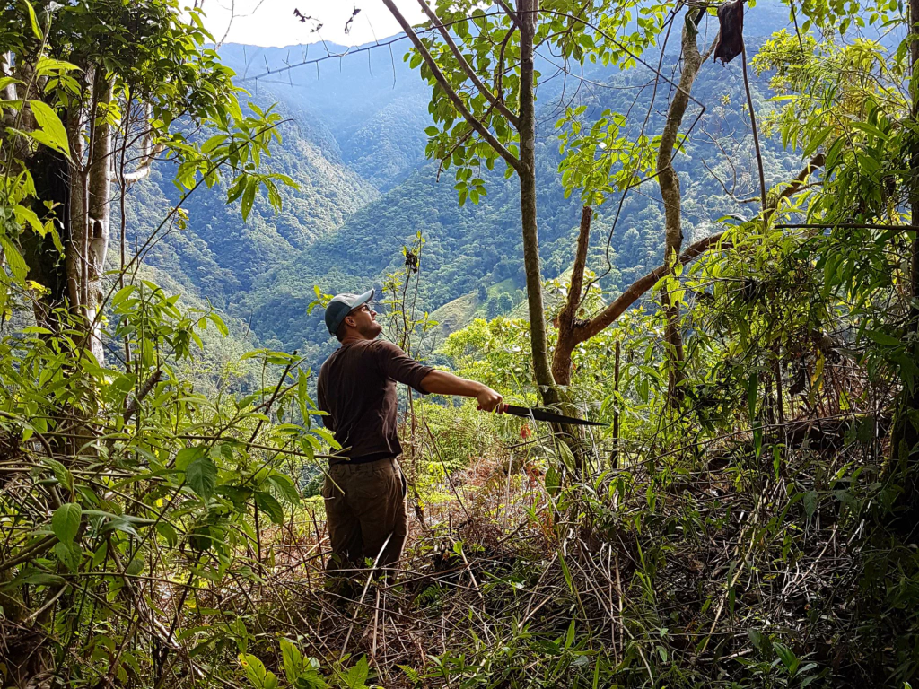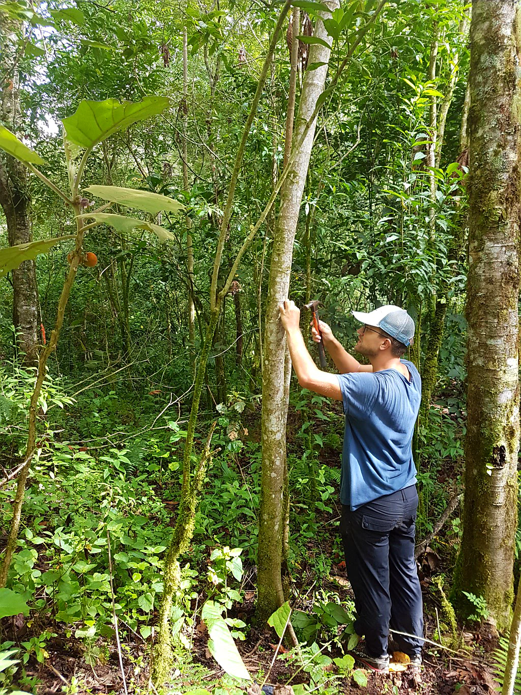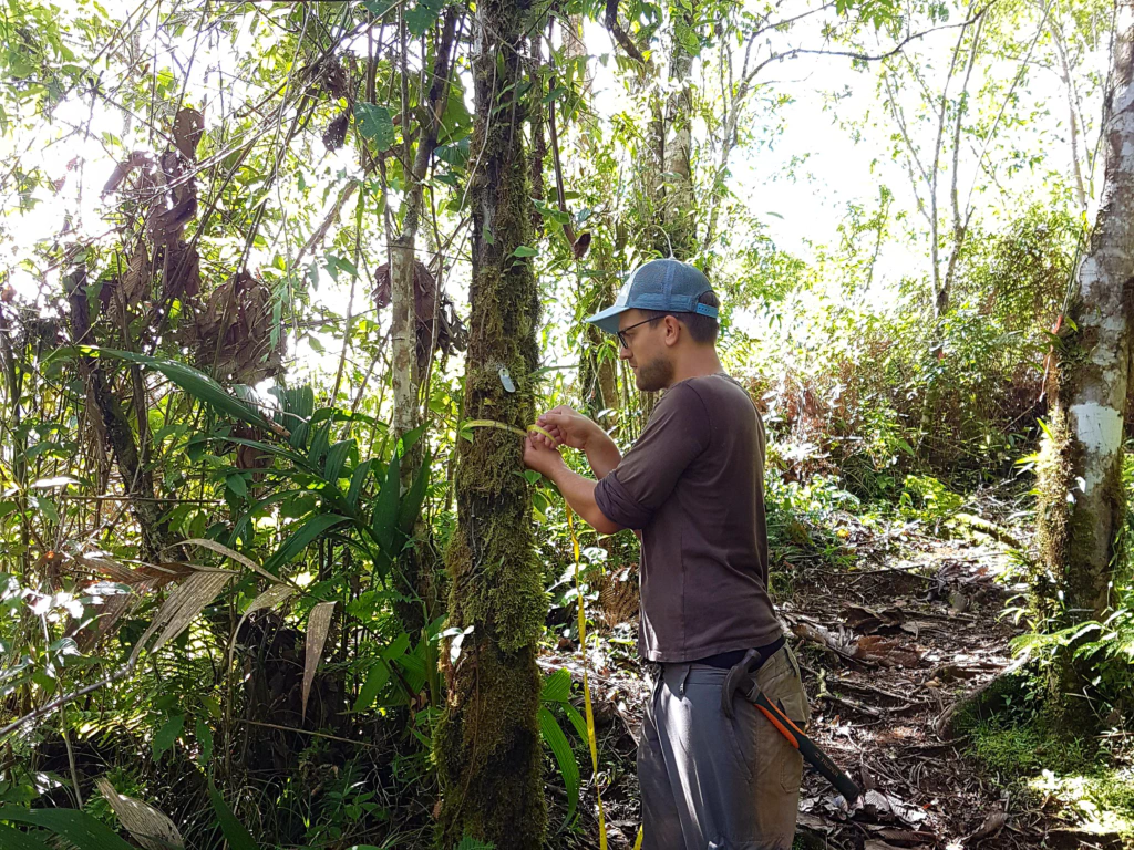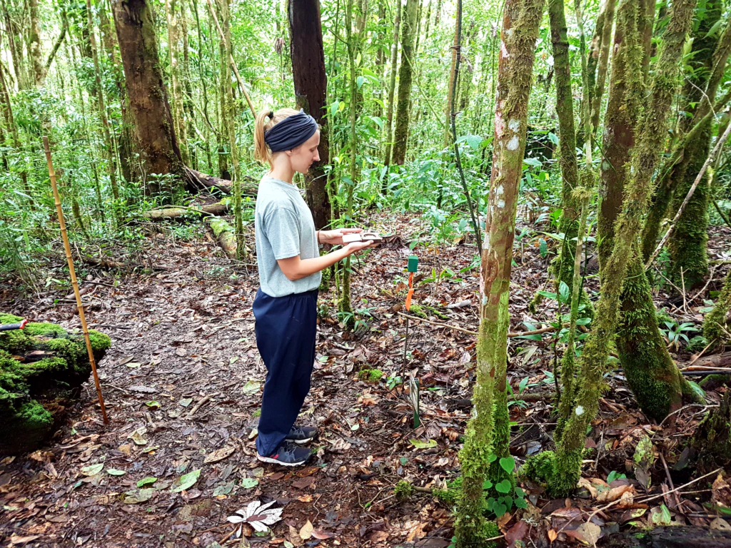 Wir helfen während unserer Zeit hier einem Forscher aus den Niederlanden, der sich den Meniskus gerissen hat und daher nicht mehr durchs Dickicht kriechen kann. Unsere Arbeit besteht darin in verschiedenen Testbereichen Bäume zu vermessen, um zu kontrollieren, wie sich die gepflanzten Bäume im Vergleich zu den selbstständig nachwachsenden entwickeln. Kurzum: Ob die Wiederaufforstung einen Vorteil bringt.