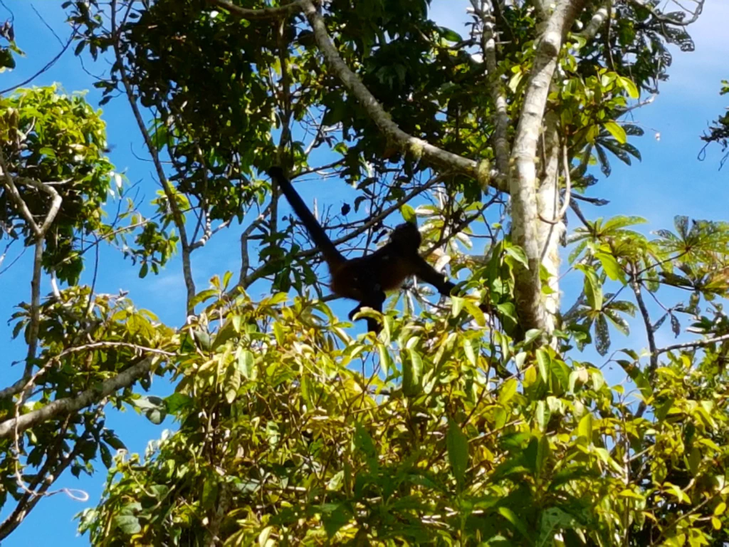 Und das Beste ist, dass wir immer wieder von den hier lebenden Tieren überrascht werden, wie zum Beispiel dieser Spinnenaffen-Familie. Leider sind aber auch hier mehr Moskitos und sonstiges Fliegevieh unterwegs als interessante Tiere.
