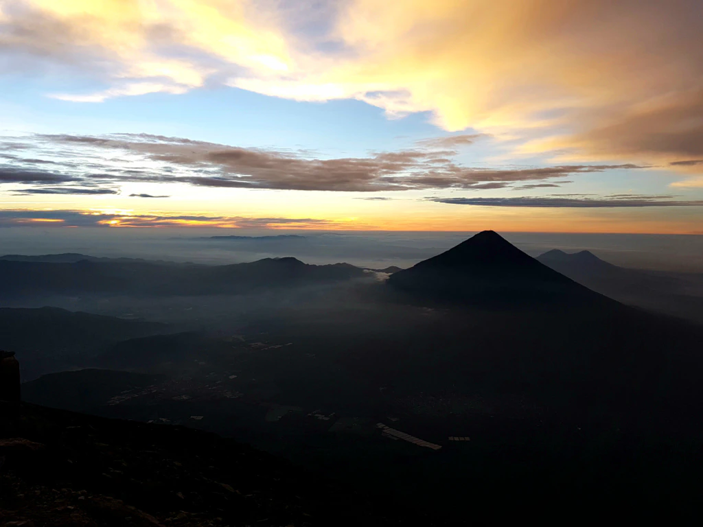 Nach einer guten Stunde waren wir als erste Gruppe auf dem Gipfel um den Sonnenaufgang hinter dem Volcán de Agua zu genießen. Okay, ehrlich gesagt, es war zu kalt um das Schauspiel so richtig zu genießen, aber wir gaben unser Bestes.