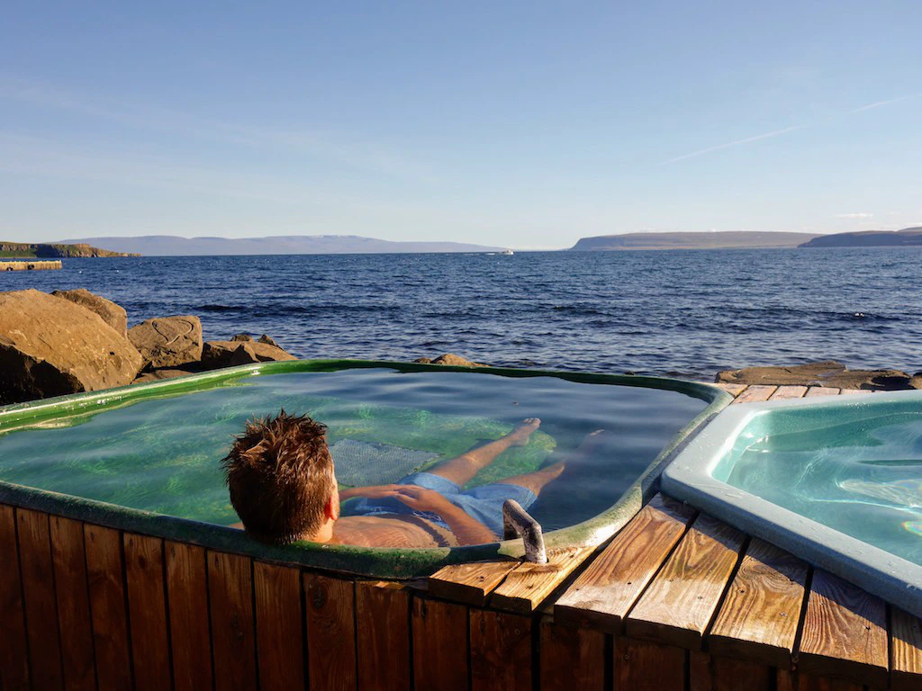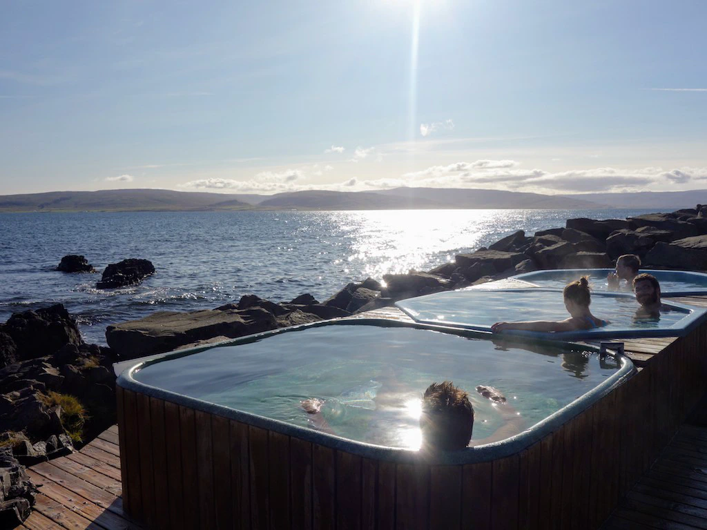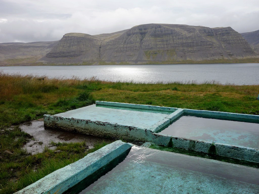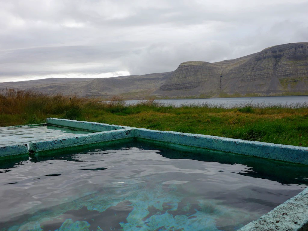Direkt an der Landstraße liegt der Hot Pot Reykjafjardalaug. Der Reykjafjardalaug ist – wie viele Hot Pots – ein künstlich angelegtes Becken, das aus einer natürlichen Quelle mit Thermalwasser befüllt wird. Für einen Hot Pot ist er ziemlich groß – und lenkt damit klug von den zwei natürlichen Hot Pot-Becken ab, die direkt hinter ihm liegen.