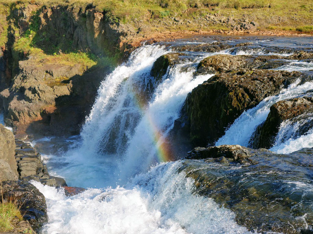 In die Schlucht Kolugljúfur stürzt ein (für isländische Verhältnisse bescheidener) Wasserfall – und wer die letzten Beiträge aufgepasst hat, weiß dass jetzt mein Herz anfing höher zu schlagen. Denn bei blauem Himmel am Wasserfall stehen die Chancen auf einen Regenbogen sehr gut. Blickt man auf den Wasserfall sah man an diesem Morgen jedoch der Sonne ins Gesicht. Ja, so kann das natürlich nichts werden! Also kraxelte ich einmal hinter den Wasserfall und – halleluja – da war endlich wieder ein Regenbogen! Hach, es ist aber auch zu schön!