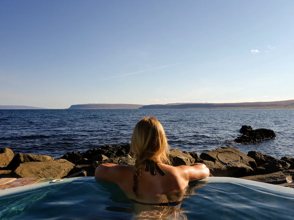 Wir sparten uns ein Bad im Reykjafjardalaug und fuhren stattdessen weiter zum Hot Pot Pollurinn. Diesen findet man wirklich nur, wenn man weiß, wo er ist. Im Zweifel nicht einmal dann. Drei kleine handgeschaffene Becken liegen erhoben über dem Fjord. Hach, ob hier wohl manchmal ein Wal vorbei schwimmt?