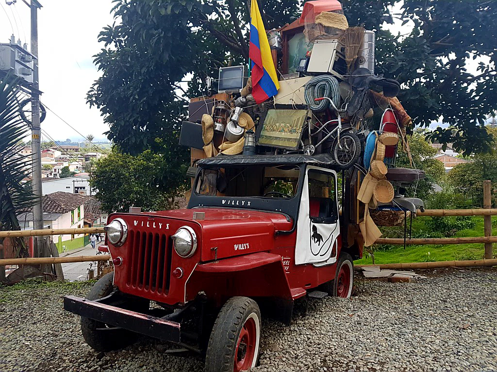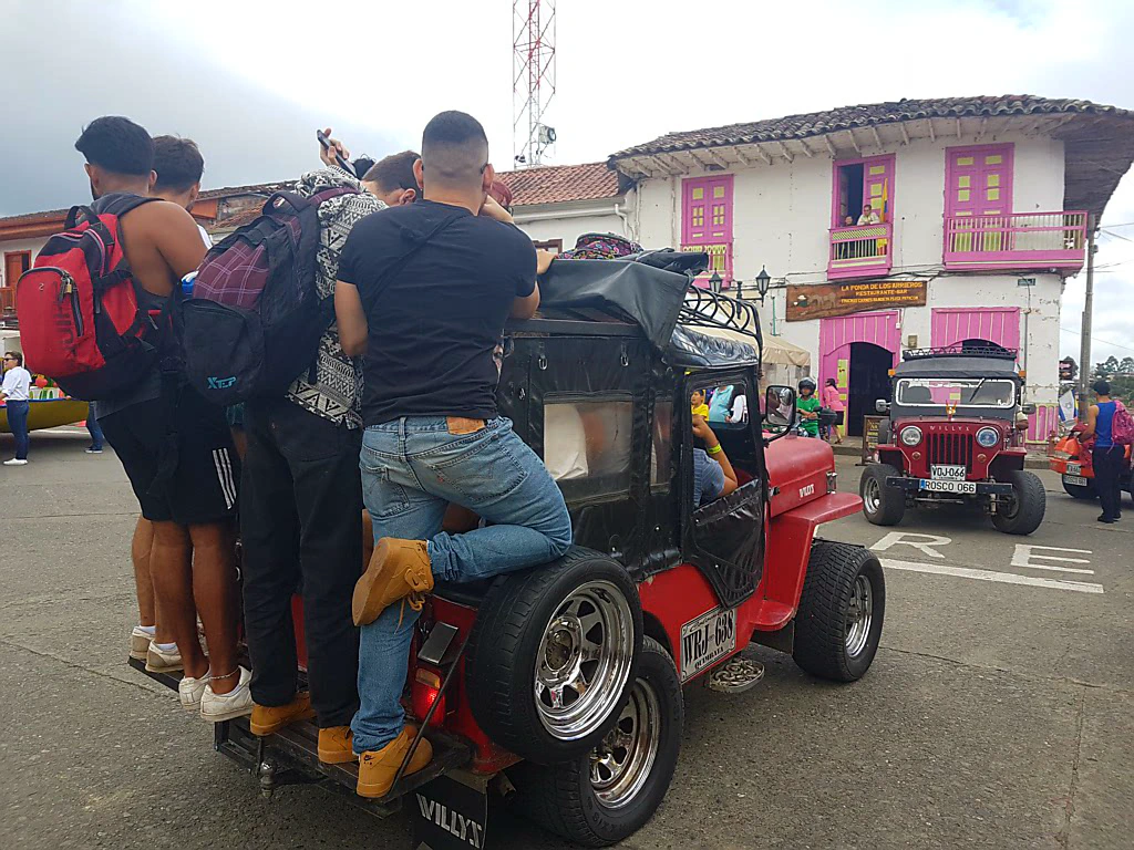 Trotz unserer umständlichen Anreise aus Jardín kamen wir nachmittags in Salento an. Statt Taxi oder Tuktuk wird man in Salento in Jeeps, sogenannten Willys, umherkutschiert, die Kolumbien den Amis nach dem zweiten Weltkrieg abkaufte. Seitdem sind sie in der Kaffeeregion im Dienst, um Huckelpisten, steile Auf- und Abstiege und schwere Lasten zu meistern. In Salento transportieren sie bis zu 13 Passagiere zusätzlich zum Fahrer!