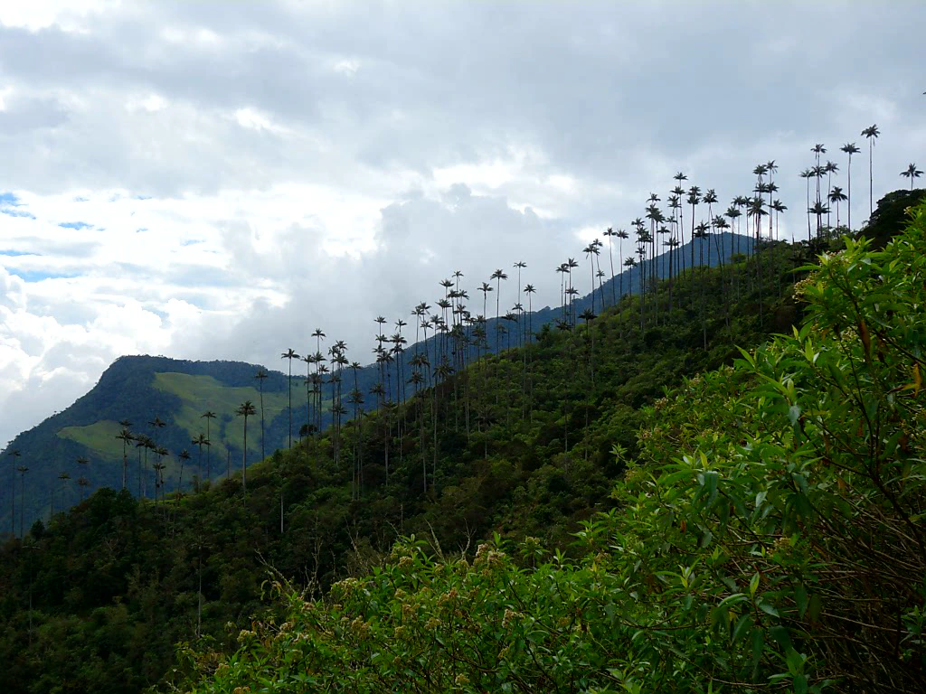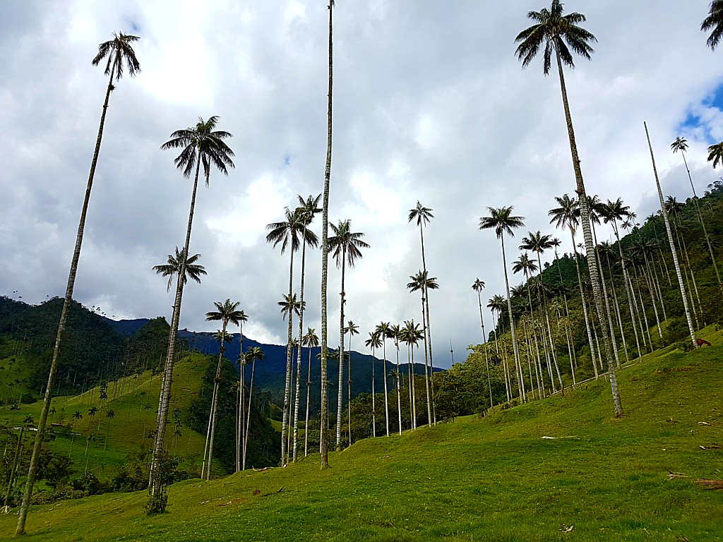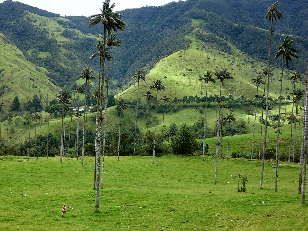 Wir waren nun schon vier Stunden unterwegs und noch immer war von den berühmten Wachspalmen, wegen denen man die Wanderung eigentlich unternimmt, keine Spur. Vom höchsten Punkt ging es auf einem weiten Waldpfad bergab. Nach fünf Stunden lichtete sich endlich der Weg und führte auf grasige Hügel, von denen hunderte Wachspalmen 60 m in die Höhe ragten.