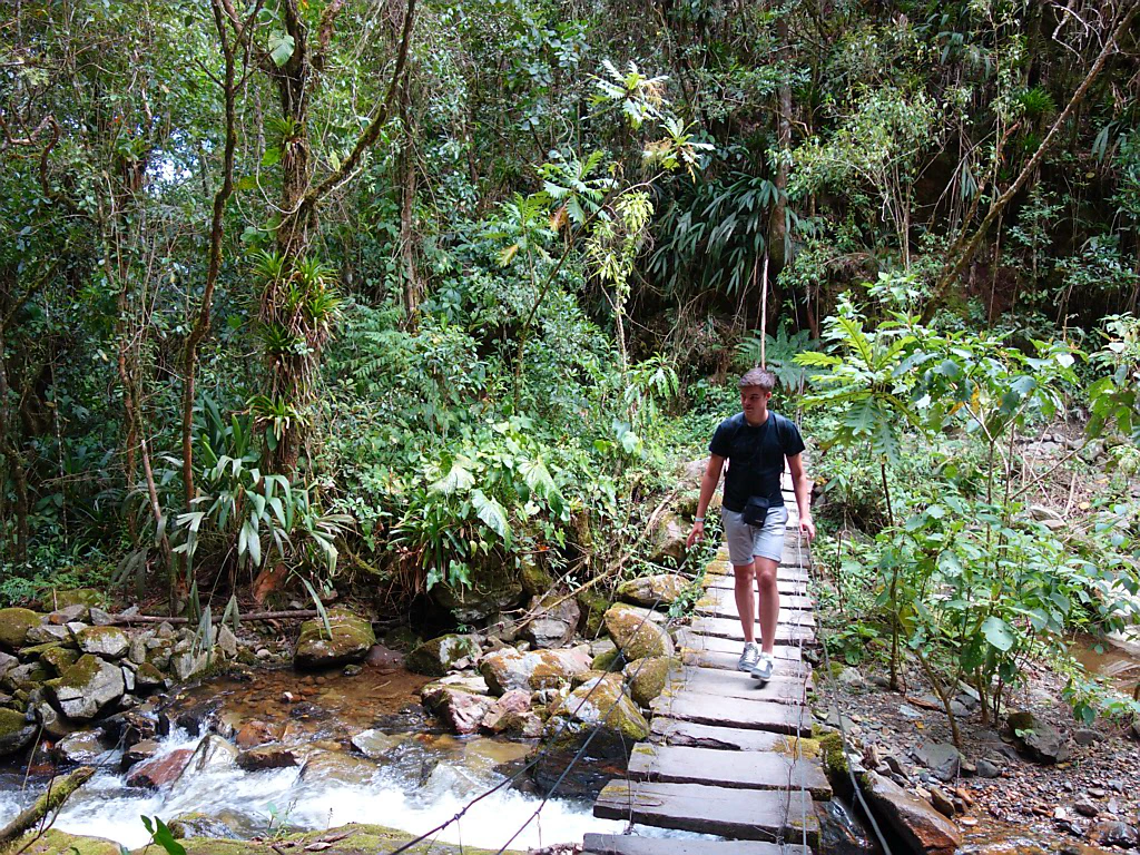 Bald führte der Weg in einen Nebelwald, in dem wir einem Fluss bergaufwärts folgten und ihn über mehrere Brücken immer wieder überquerten.