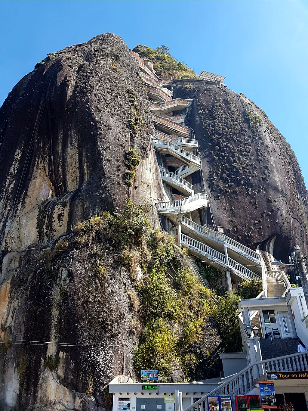Und genau zu diesem Felsen machten wir uns als Erstes nach dem Einchecken auf. Der Piedra del Peñol bzw. Peñon de Guatape (man ist sich über den Namen nicht einig) ist ein Monolith, der den Stausee um 200 m überragt. In seinen Hang wurden 700 Treppenstufen eingelassen und sein Gipfel wurde mit einem Türmchen gekrönt, so dass man nach dem Aufstieg mit einem 360 Grad Ausblick belohnt wird.