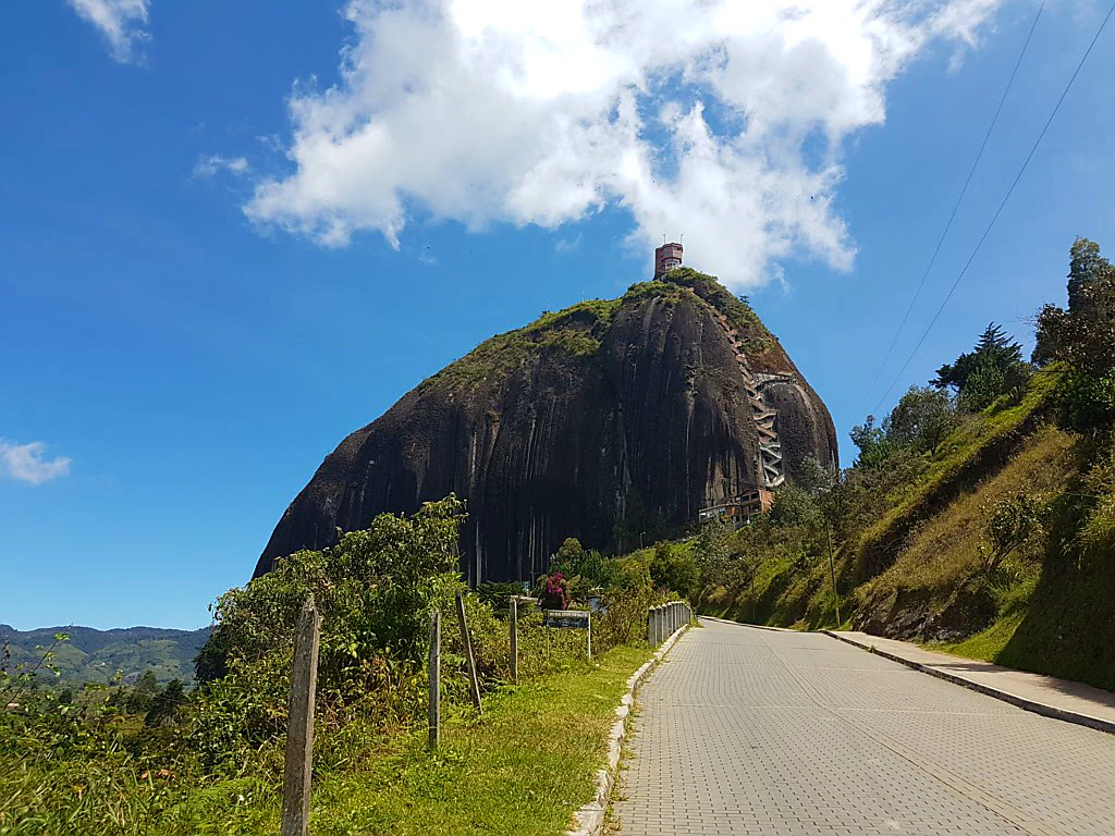 Mein Wohltäter war übrigens der Besitzer des Cafés auf dem Turm des Piedra del Peñol, was ich ihm angesichts seines Top-Motorrads sogar glaube. Nach schweißtreibenden zehn Minuten Fahrt waren wir am Fuße des Felsens angekommen, ich sprang ab und der Kolumbianer ratterte davon. Überlebt!