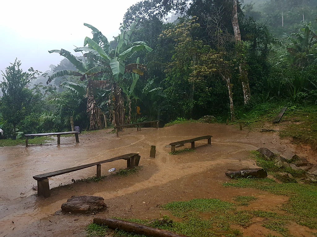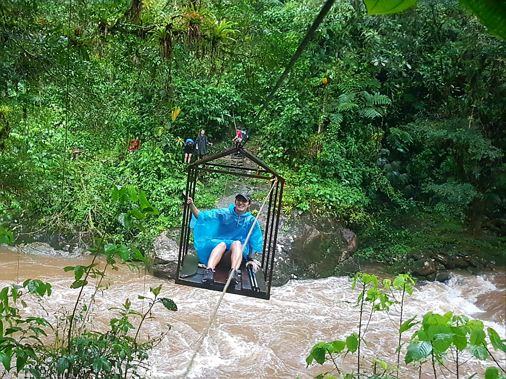 Da der Regen auch nach einer halben Stunde nicht nachgab, ging es eben mit Poncho weiter. Auch wenn unsere T-Shirts eh nicht mehr nasser werden konnten… Bald mussten wir den breiten Fluss Buritaca überqueren, der sich aufgrund des Niederschlags zu einem reißenden braunen Strom entwickelt hatte. Gut für uns, denn so kam die manuelle Seilbahn zum Einsatz, in der wir einer nach dem anderen über den Fluss gezogen wurden.