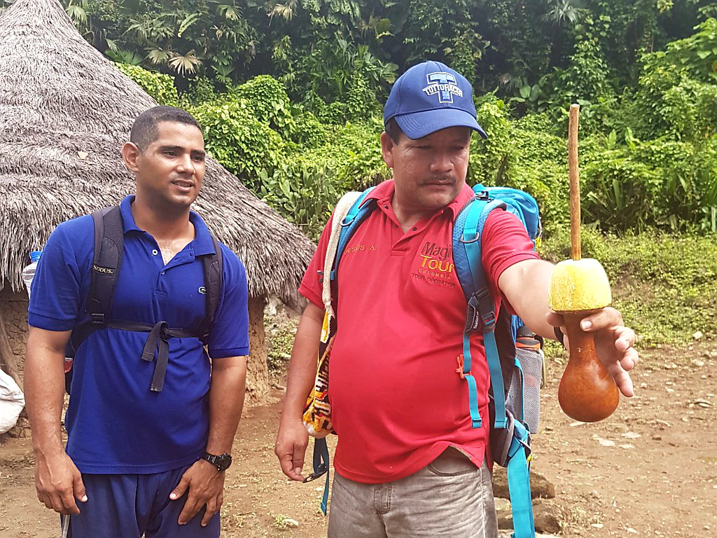 Am Abend erzählte uns dann Jesús endlich, was es mit dem Poporo auf sich hat, den die Kogi-Männer unablässig mit sich herumtragen. Es ist etwas kompliziert. Kurzgesagt befindet sich in einem gehärteten Kürbis pulverisierter Schneckenhauskalk. Diesen mischen die Kogi in ihrem Mund mit kokablattgetränktem Speichel und schmieren die Substanz immer im Kreis entlang des Kürbiskopfes, wodurch eine gelbe feste Masse entsteht. Sie sagen, dass sie so ihre Gedanken aufschreiben (sie haben keine Schriftsprache), bzw. der Schamane kann darin auch Naturkatastrophen vorhersehen sowie den Gesundheitszustand seiner Männer. Ich frage mich vor allem, wer eigentlich als Erstes auf diese Idee kam…