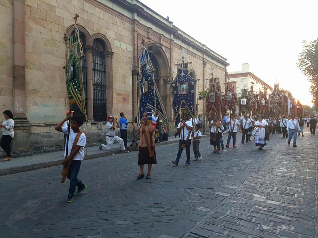 Als wir am Marktplatz ankamen, gab es dort einen riesigen Menschenauflauf! Allerdings keine Semana Santa-Feierlichkeit, sondern ein Protest, zu dem haufenweise Menschen aus den umliegenden Orten angereist waren. Wie wir später erfuhren, haben die Oaxaqueños eine ausgeprägte Protest-Kultur. Wenn ihnen etwas nicht passt, gehen sie auf die Straße. Und haben damit dann und wann auch Erfolg, z.B. verhinderten sie so die Eröffnung einer McDonald’s Filiale auf dem Marktplatz.