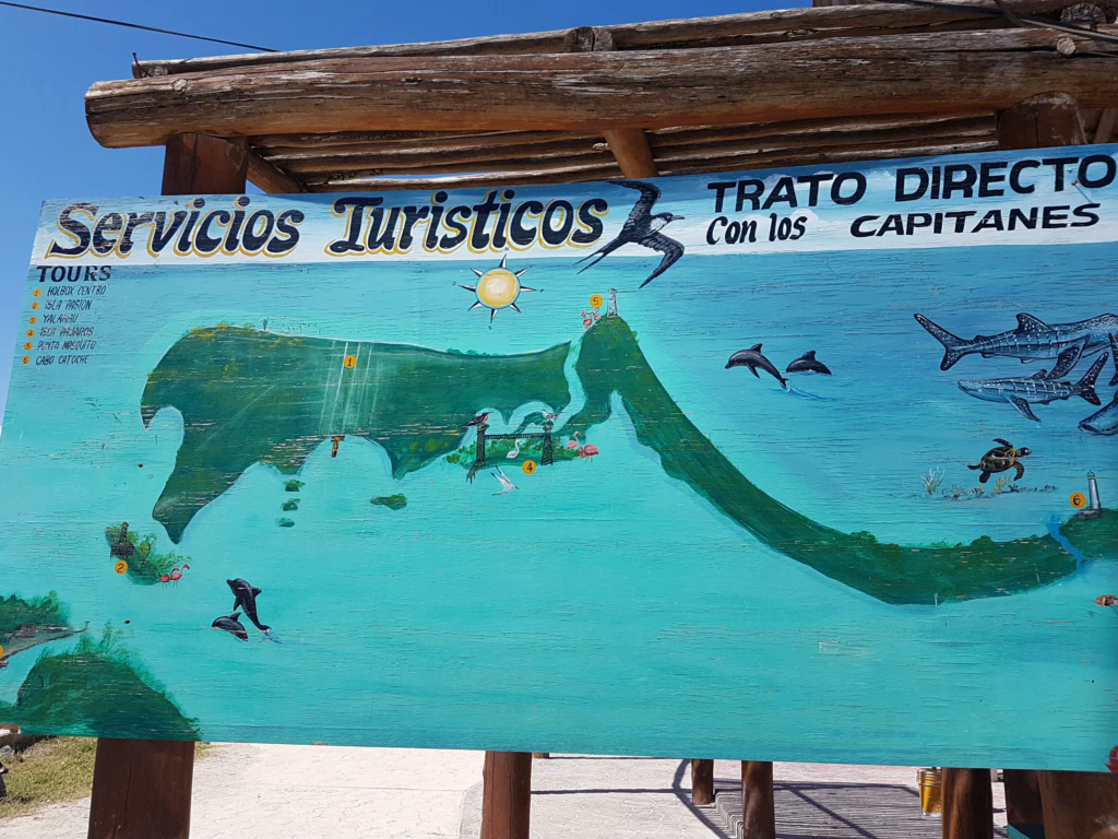 Mit dem Bus fuhren wir frühmorgens von Cancún drei Stunden in das kleine Hafenörtchen Chiquilá, von wo man auf die Isla Holbox übersetzt. Etwas unbequem, da wir der Sicherheit mexikanischer Busfahrten nicht trauten und unsere Rucksäcke nicht im Gepäckraum verstauen wollten, sondern mit zu unseren Sitzplätzen nahmen. Leider passen sie nicht in das Gepäckfach über den Sitzen, so dass wir sie im Fußraum unterbringen mussten.