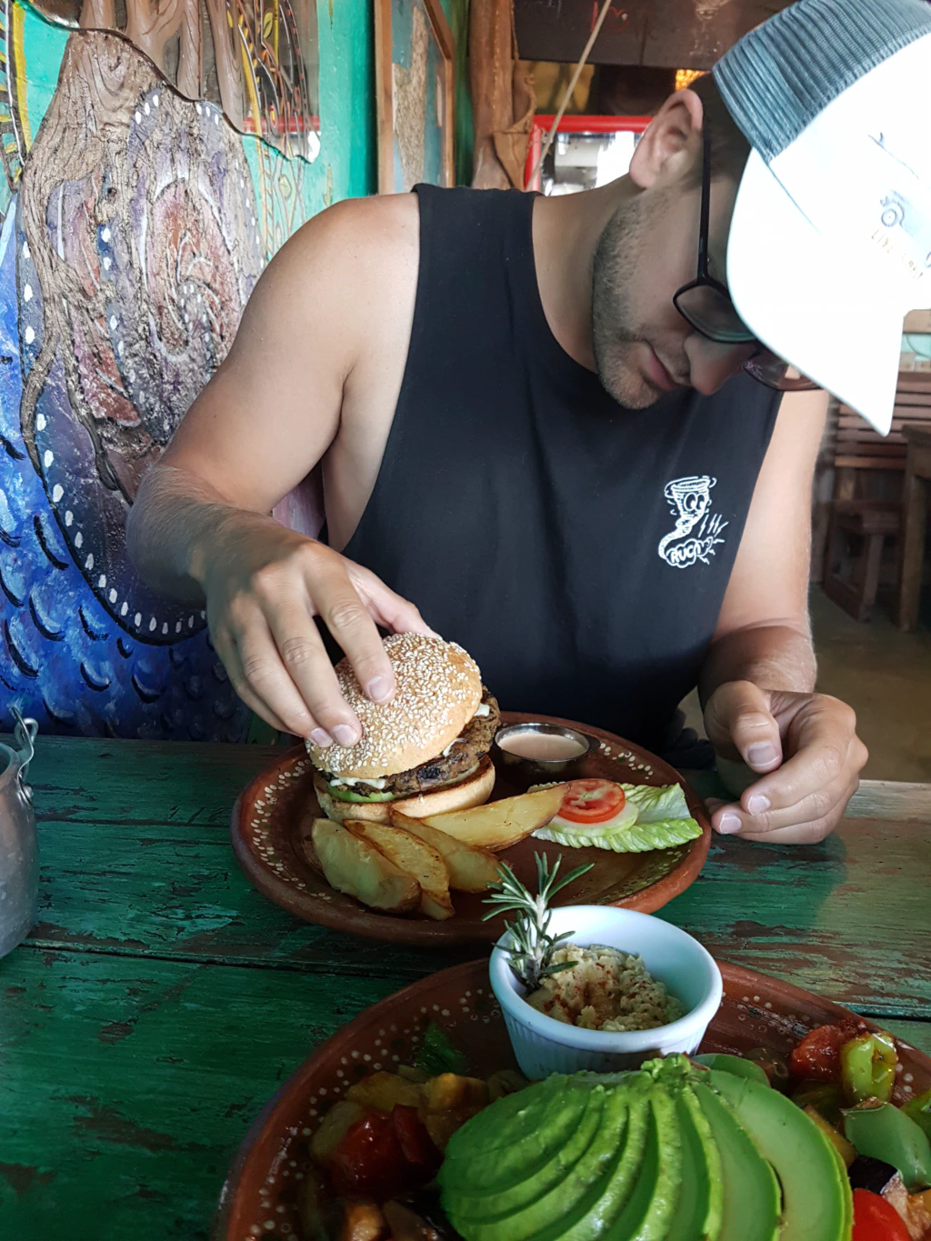 Als Ausgleich ging es abends - schon zum zweiten Mal - zu El Vegetariano. Wohlbemerkt auf Jans Vorschlag hin! Und hier ist das Beweisfoto: bereits sein zweiter vegetarischer Burger!