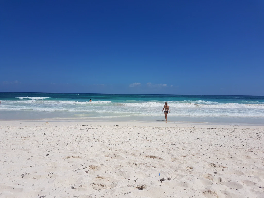 Vom Café führt ein Sandweg an den schönen Strand von Tulum. Übrigens sind alle Strände Mexikos generell öffentlich. Man kann sich also überall hinlegen, auch wenn die Hotels mit ihren Liegen den Anschein machen, es sei ein Privatstrand.