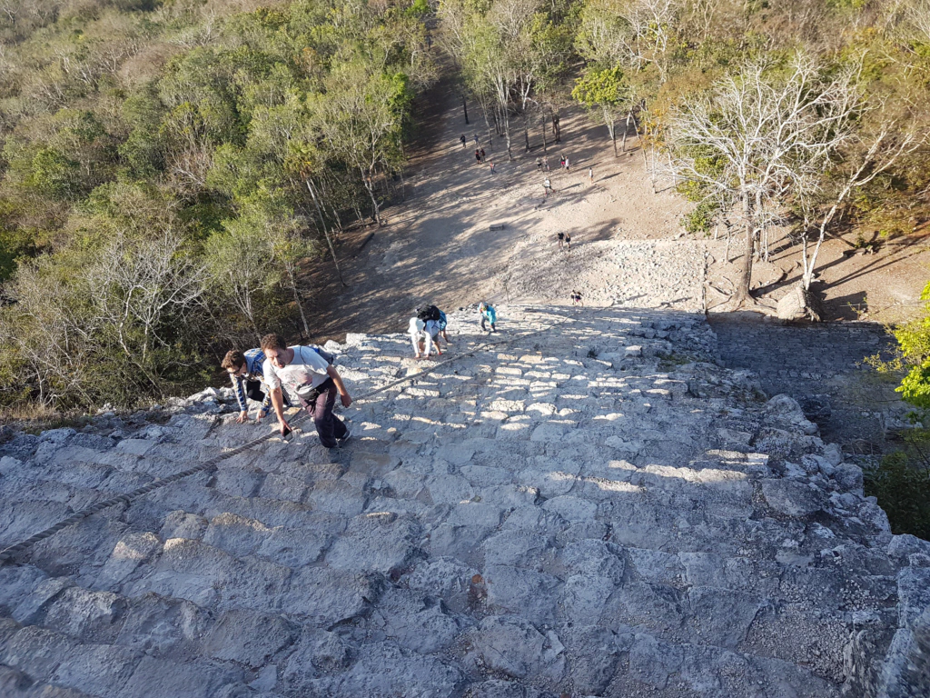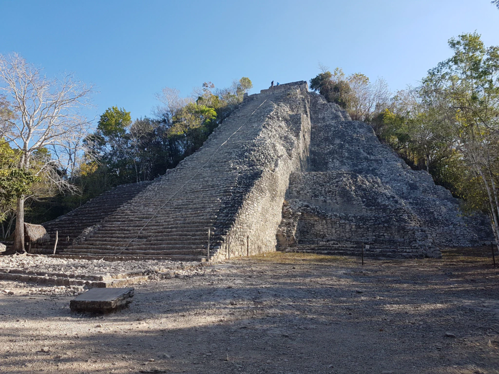 Die Hauptattraktion ist die 42 m und 120 Treppenstufen hohe Pyramide Nohoch Mul, die man sogar hinaufsteigen kann. Ich denke allerdings ’noch’, denn gut tut das dem Erhalt der Ruinen sicherlich nicht.
