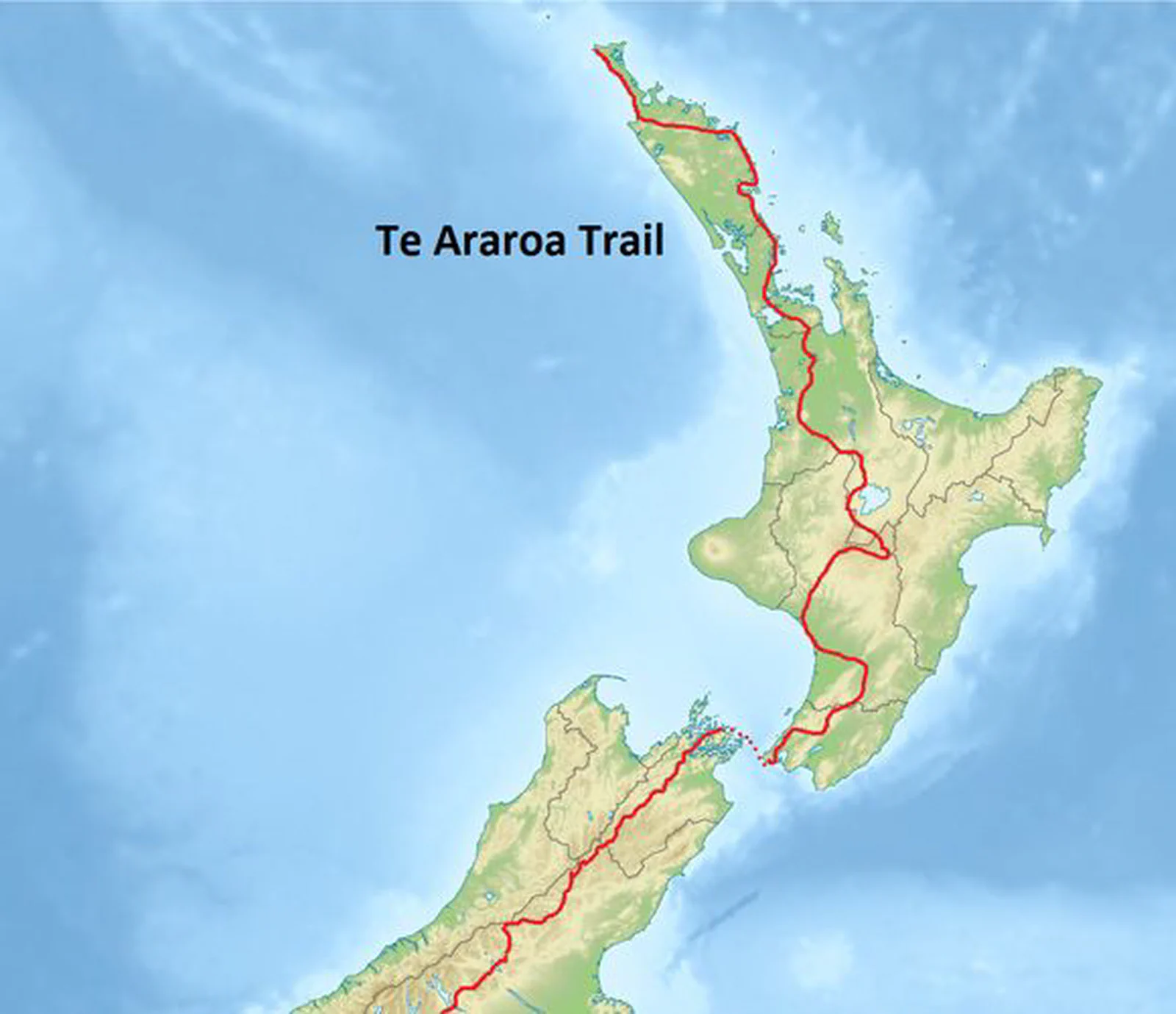 Der Te Araroa ist eine Langstreckenwanderung 3000km der Länge nach durch Neuseeland. Er startet am Cape Reinga, dem nördlichsten Punkt der Nordinsel, und endet in Bluff, dem südlichsten Punkt der Südinsel.