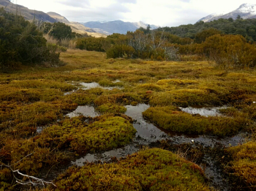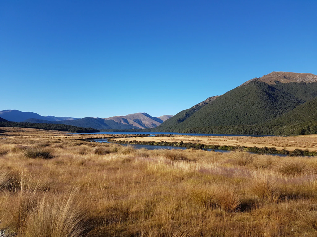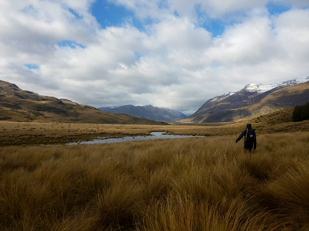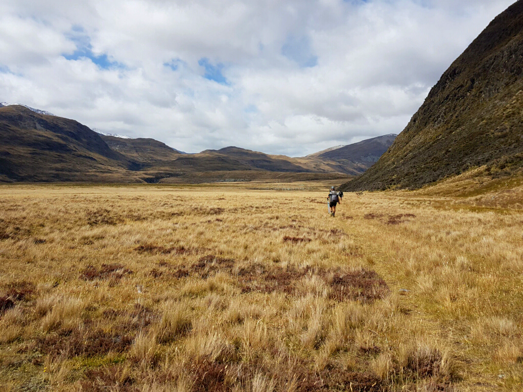 Am nächsten Tag ging es auf den Mavora Walkway. Wir hatten gar keine Vorstellungen von bzw. Erwartungen an diesen Abschnitt. Umso überraschter waren wir von der Schönheit dieser Etappe. Nachts war Schnee auf die nächstgelegenen Berggipfel gefallen. Die Landschaft war zwar ein Sumpfgebiet – was fürs Wandern zugegeben ziemlich unangenehm war (kalte und nasse Füße) – aber sie zeigte sich in einer pastellfarbenen Weite, dass wir uns fühlten, als seien wir endgültig in Mittelerde angekommen…