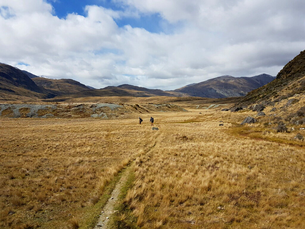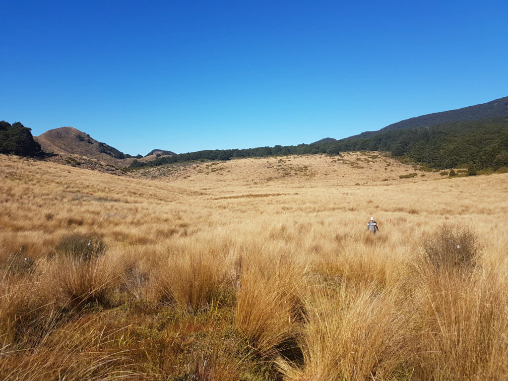 - raus in sumpfige Tussock-Felder, in denen der Weg kaum zu erspähen war und die Sonne brannte