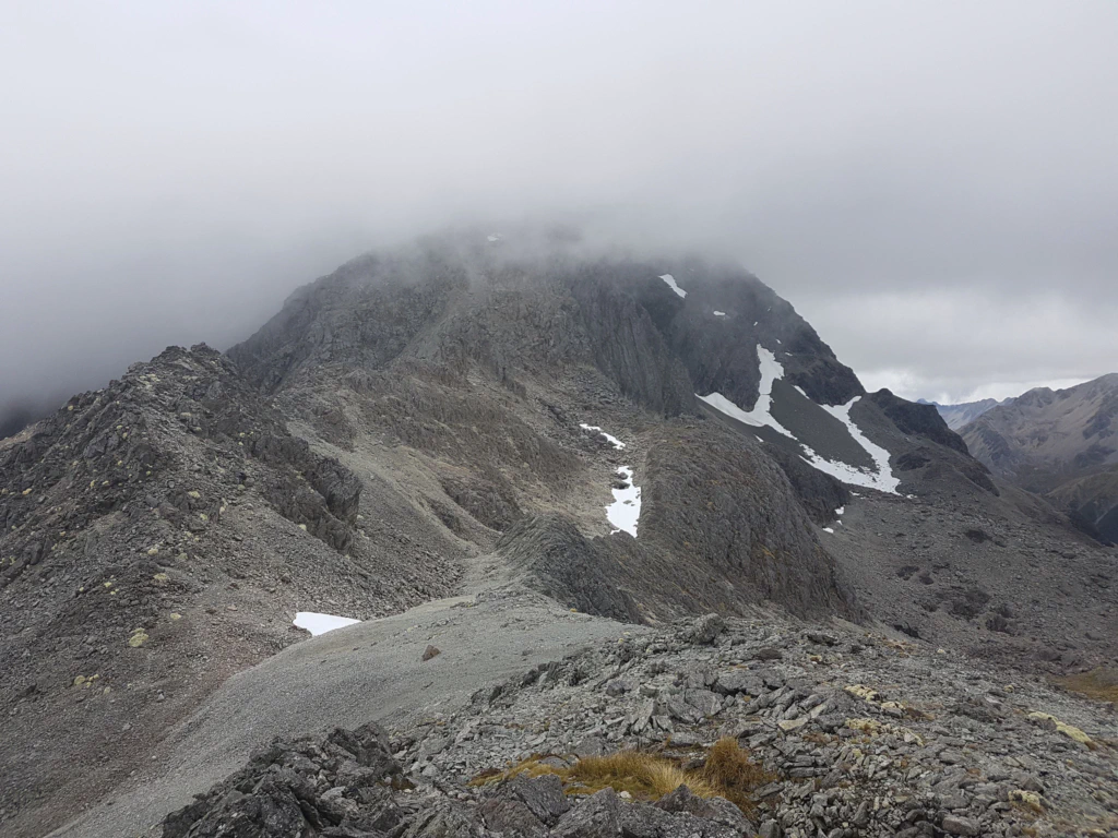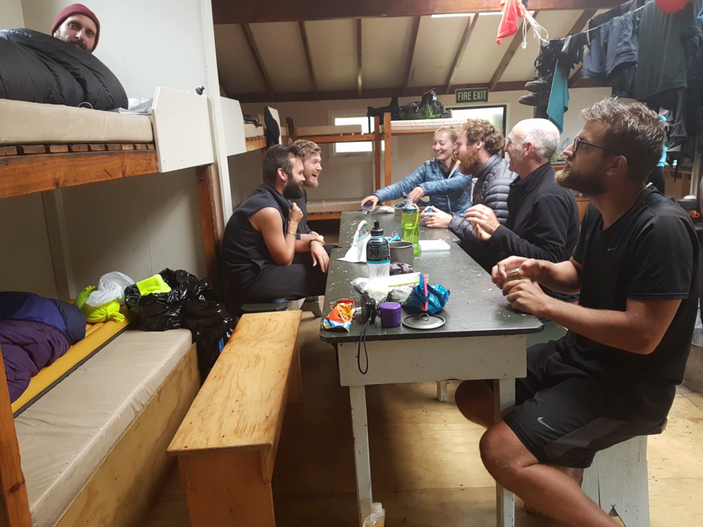 Als wir am nächsten Tag aufwachten, war der Himmel völlig verhangen und es nieselte… Da der kommende Abschnitt über den Traverse Saddle (1787 m) führt und wir dafür gute Sicht haben wollten (allerdings eher für die guten Fotos als für die notwendige Orientierung), liebäugelten wir bereits damit eine Nacht in der Hütte zu bleiben. Die Hütte liegt in einer malerischen Bergkulisse – anderenorts wäre sie als Luxus Alpine Lodge durchgegangen. Kein schlechter Ort für einen Tag Pause. Aber gegen späten Vormittag klarte es auf und so zogen wir doch los.
