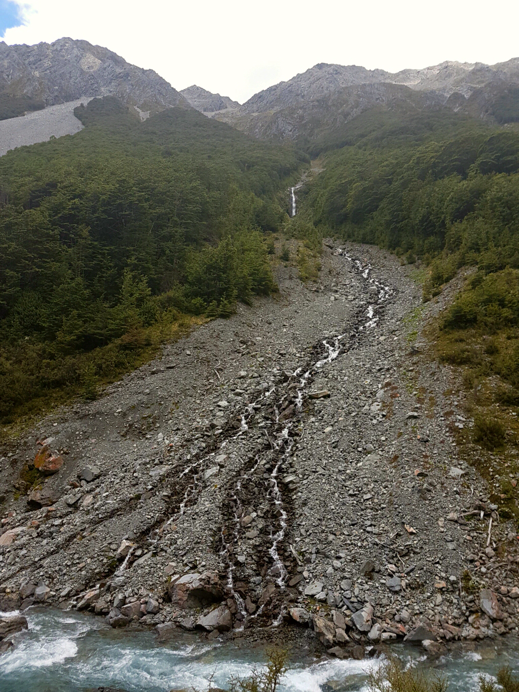 Nach der Passüberquerung führte unser Weg zur Blue Lake Hut entlang des reißenden Sabine Rivers durch Wald, in dem riesige blanke Felsbrocken lagen. Ich wunderte mich, dass diese Felsen so sauber und eisgrau waren, denn viele andere Felsen waren komplett bemoost. Es stellte sich später heraus, dass sich diese Felsbrocken durch das große Erdbeben im November gelöst hatten und ins Tal gefallen waren! Da wird einem schon etwas mulmig… Leider hatte ich beim Vorbeigehen keine Bilder gemacht, da ich die bemoosten Waldabschnitte viel schöner fand.