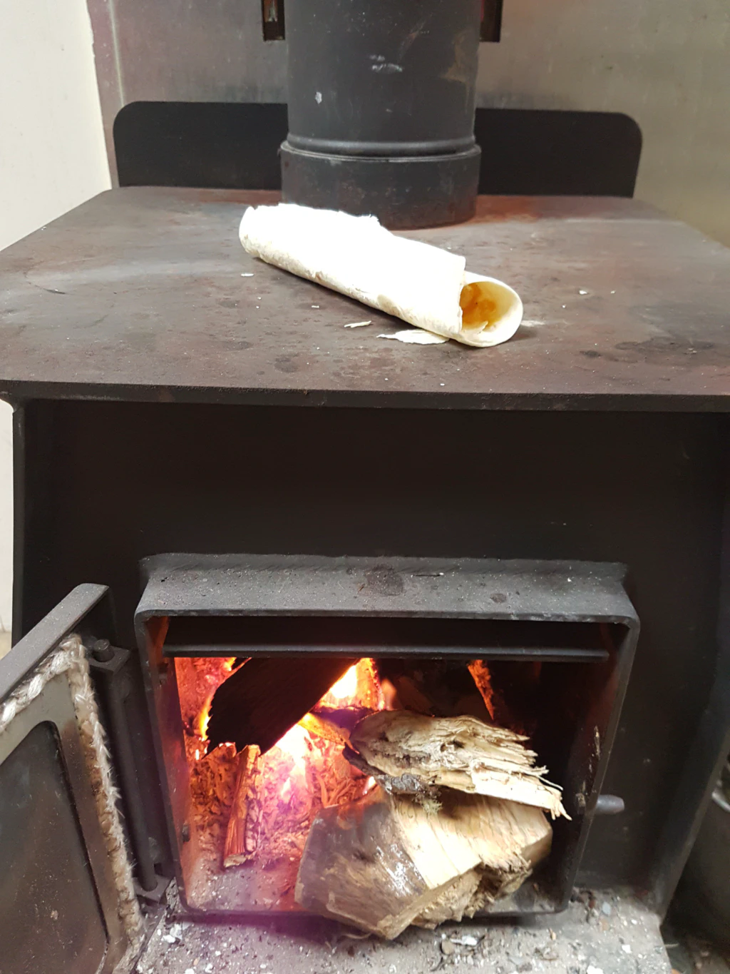 Eine Stunde später fing es erneut an wie aus Eimern zu gießen und hörte den gesamten restlichen Tag nicht auf! Glück gehabt! Und es gibt wahrlich Schlimmeres als bei einem warmen Feuerchen in einer Hütte zu sitzen und Wraps auf dem Ofen zu rösten (ok, einen Wrap pro Person – mehr sieht die Tagesration nicht vor).