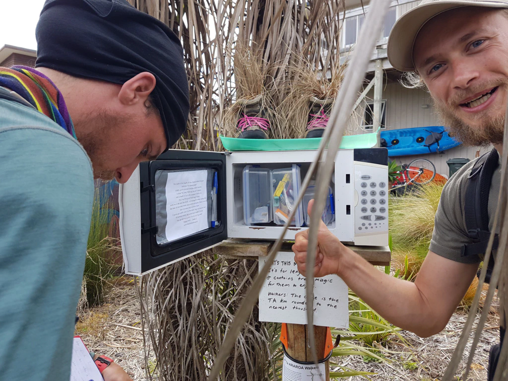In dem Ort Ngunguru fanden wir diese schöne Überraschung am Wegesrand: in einer Mikrowelle versteckt warteten lauter kleine Nützlichkeiten für den Wanderer. Linda weiß eben, was einem im Rucksack fehlen kann: Sie ist 2011 als eine der ersten den Te Araroa gelaufen.