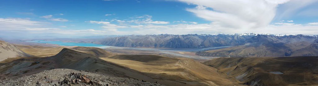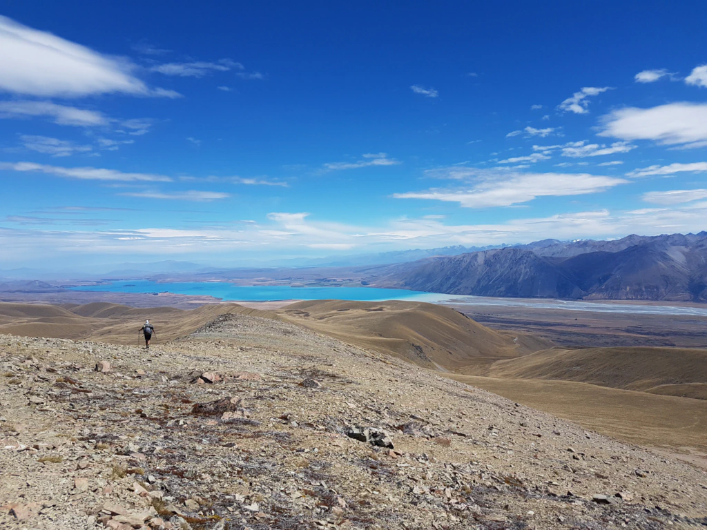 Da dieser höchste Punkt nur ein Sattel ist und kein Gipfel, kraxelten wir noch weitere 150 Höhenmeter auf den benachbarten Beuzenberg Peak. Was für eine Aussicht! In strahlendem Türkis erstreckte sich Lake Tekapo vor uns und die Wolken gaben den Blick auf Mount Cook und den Tasman Gletscher frei. Wow!