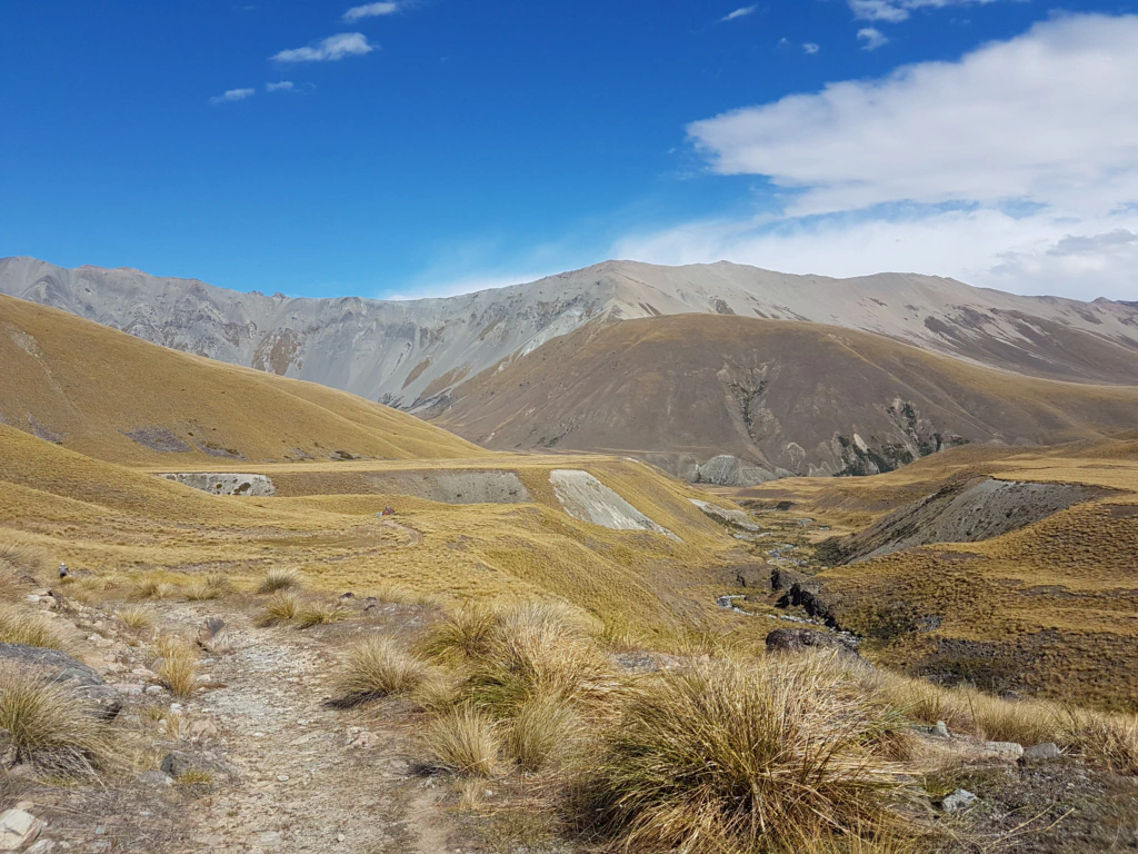 In der Landschaft des nächsten Tages kamen wir uns so vor, als würden wir in einer Herr der Ringe-Filmkulisse herumwandeln: weite Tussock-Felder, sanfte Hügel, Flüsse und in der Ferne höher aufragende felsige Berge.