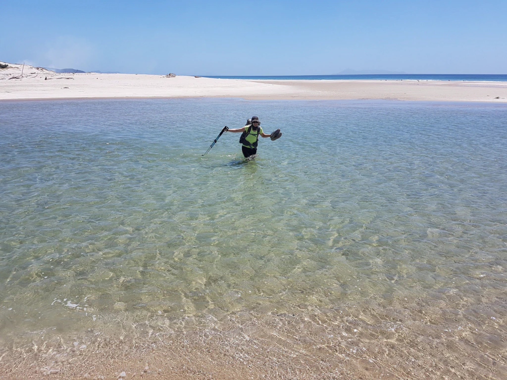 Am nächsten Tag lag eine lange Strandetappe mit zwei Flussdurchquerungen vor uns. Die erste Flussdurchquerung war noch relativ harmlos – das Wasser reichte uns bis zum Po.