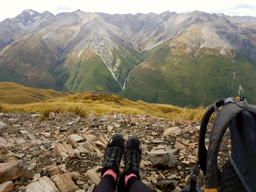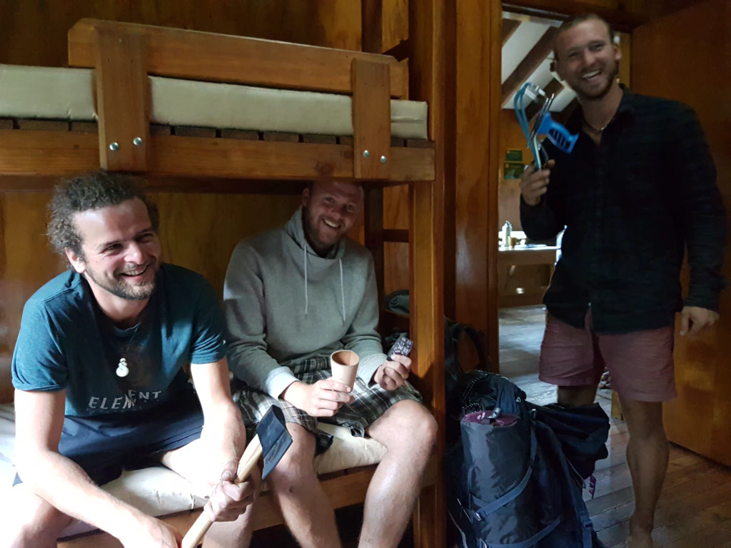 Am Abend in der Hamilton Hut trafen wir auf ein deutsches Trio, das vor zwei Tagen den Trail gestartet hat. Wir dachten, es wäre ein Scherz, als sie uns erzählten, dass ihre Rucksäcke so schwer seien, da sie eine Axt, eine Steinschleuder, einen Würfelbecher und je fünf Unterhosen dabeihätten. Bilder sagen mehr als tausend Worte… Sie waren doch recht neidisch auf unsere 7kg Leichtgewichte…